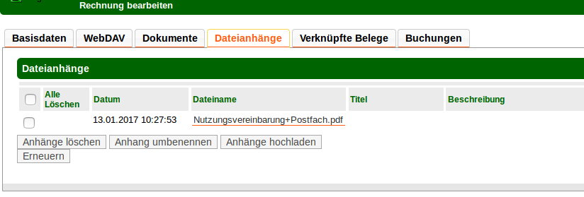 Bei den Dateianhängen wird immer nur die aktuelle Version einer Datei angezeigt. Wird eine Datei mit gleichem Namen hochgeladen, so wird eine neue Version der Datei erstellt. Vorher wird der Anwender durch einen Dialog gefragt, ob er eine neue Version anlegen will oder ob er die Datei umbenennen will, falls es eine neue Datei sein soll.